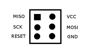 燒錄器的腳有這六根,其中的SCK、MOSI、MISO是SPI通訊要用的,RESET是清除Flash用的,VCC和GND則是讓燒錄器檢查晶片目前的工作電壓是否正常